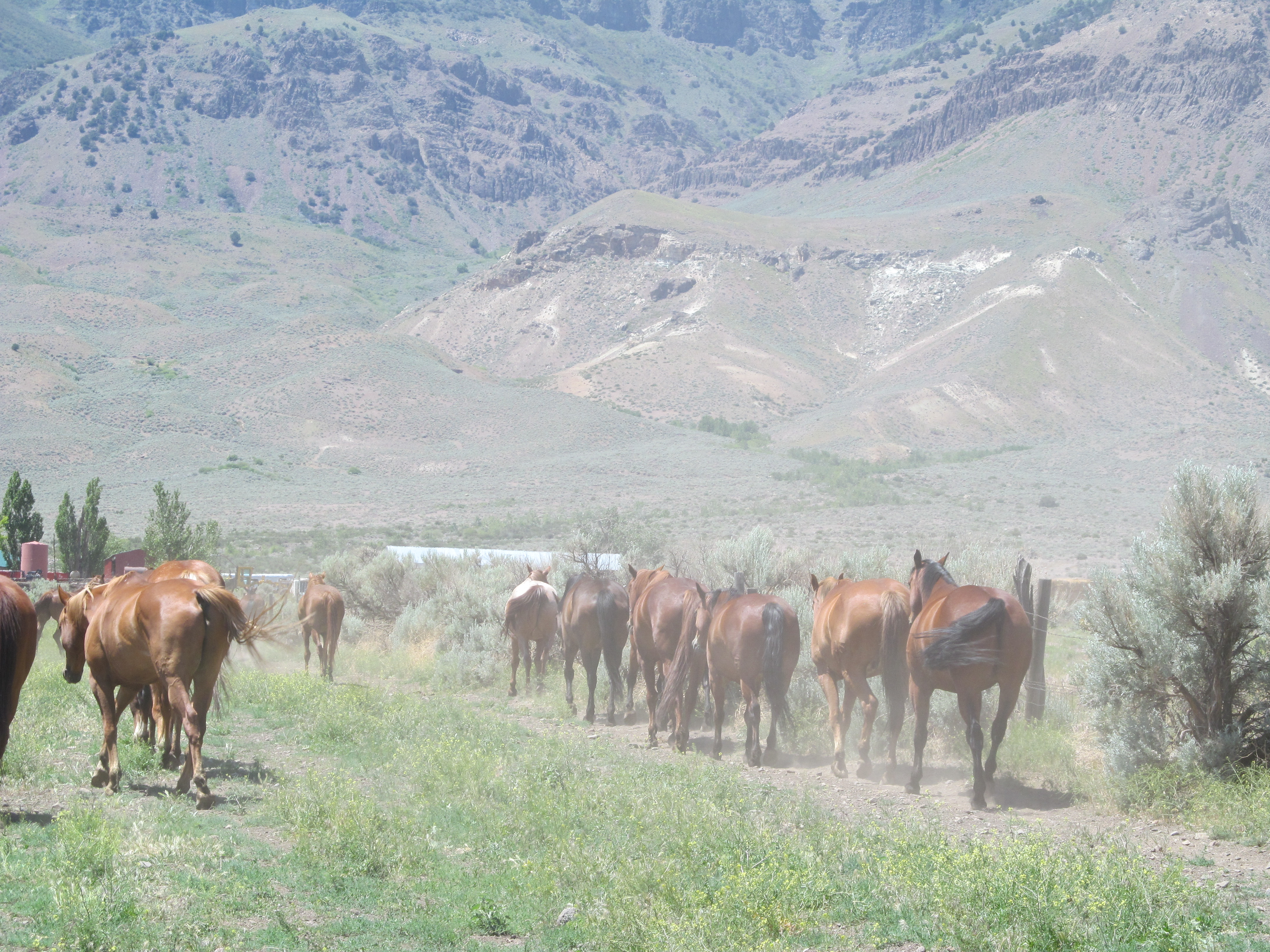 Here at the Rancho de Single Rig (aka the Alvord Ranch), the cavvy lives a mere quarter-mile from our house as the crow flies. As the crow walks down the road and through the gates, it’s about a mile-long trip. To get out of the house and mix it up, Grace and I wrangle for the crew whenever they need an afternoon wrangle. If they want ’em in before first light, they’re on their own, but we help them get a second circle started.