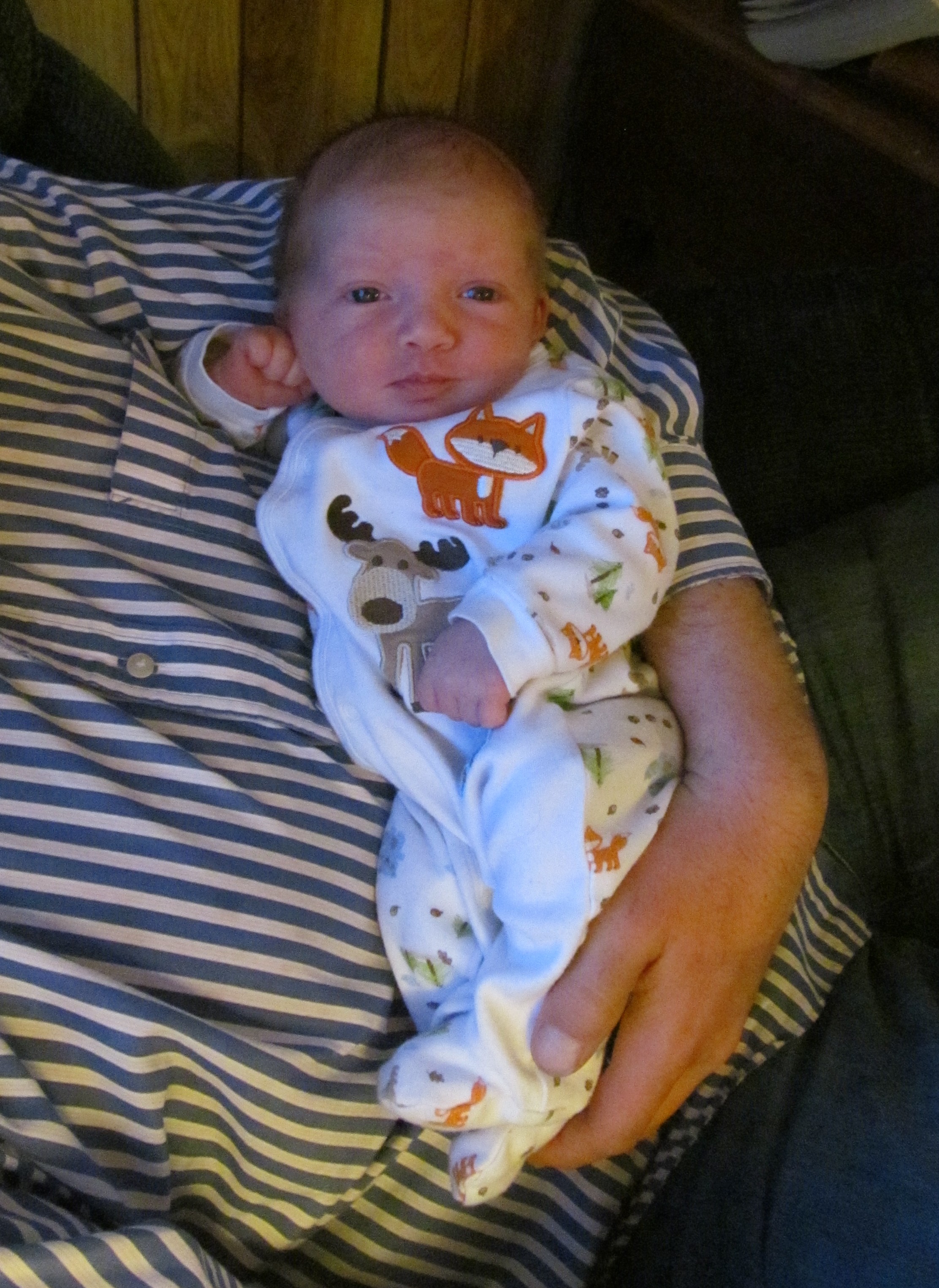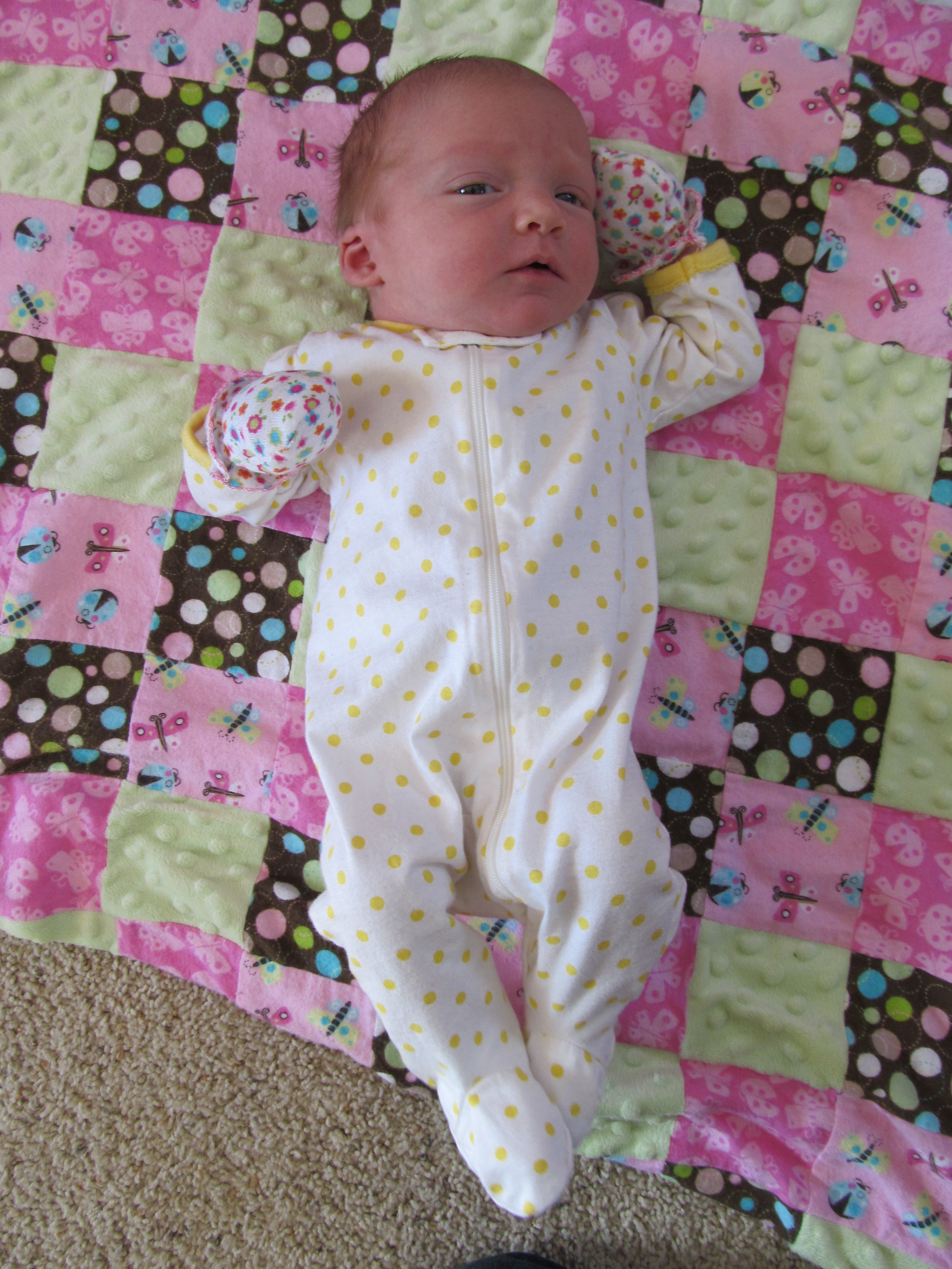 “She wore an itsy-bitsy, teeny-weeny/Yellow polka-dot…onesie.” Isn’t that how the song goes? Here, 3-week-old baby Grace shows off her stylish sleeper, cozy/self-protective mittens and the dark hair she was born with. She is laying on a handmade baby blanket made especially for her by Grandma Denise, who picked out each bolt of fabric, cut each one into small squares, then painstakingly sewed them together in a carefully planned patchwork design.
