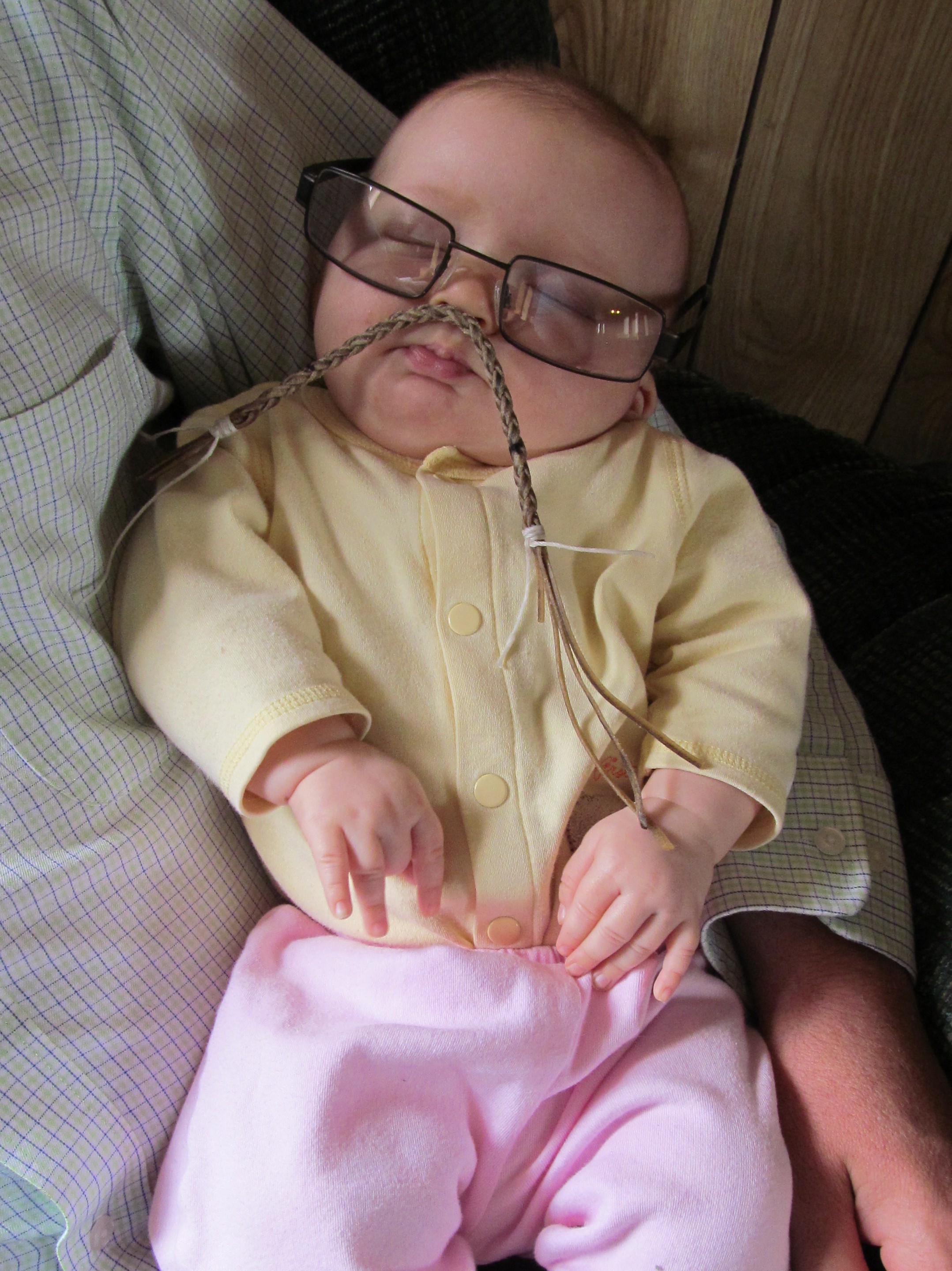 This is what happens when daddies are allowed to actively participate in their child’s upbringing. Glasses by Speedy Specs, onesie and bottoms from hand me downs, mustache by our in-house rawhider. What mother doesn’t dream of the day she will describe her newborn daughter’s mustache? I’m a lucky woman.