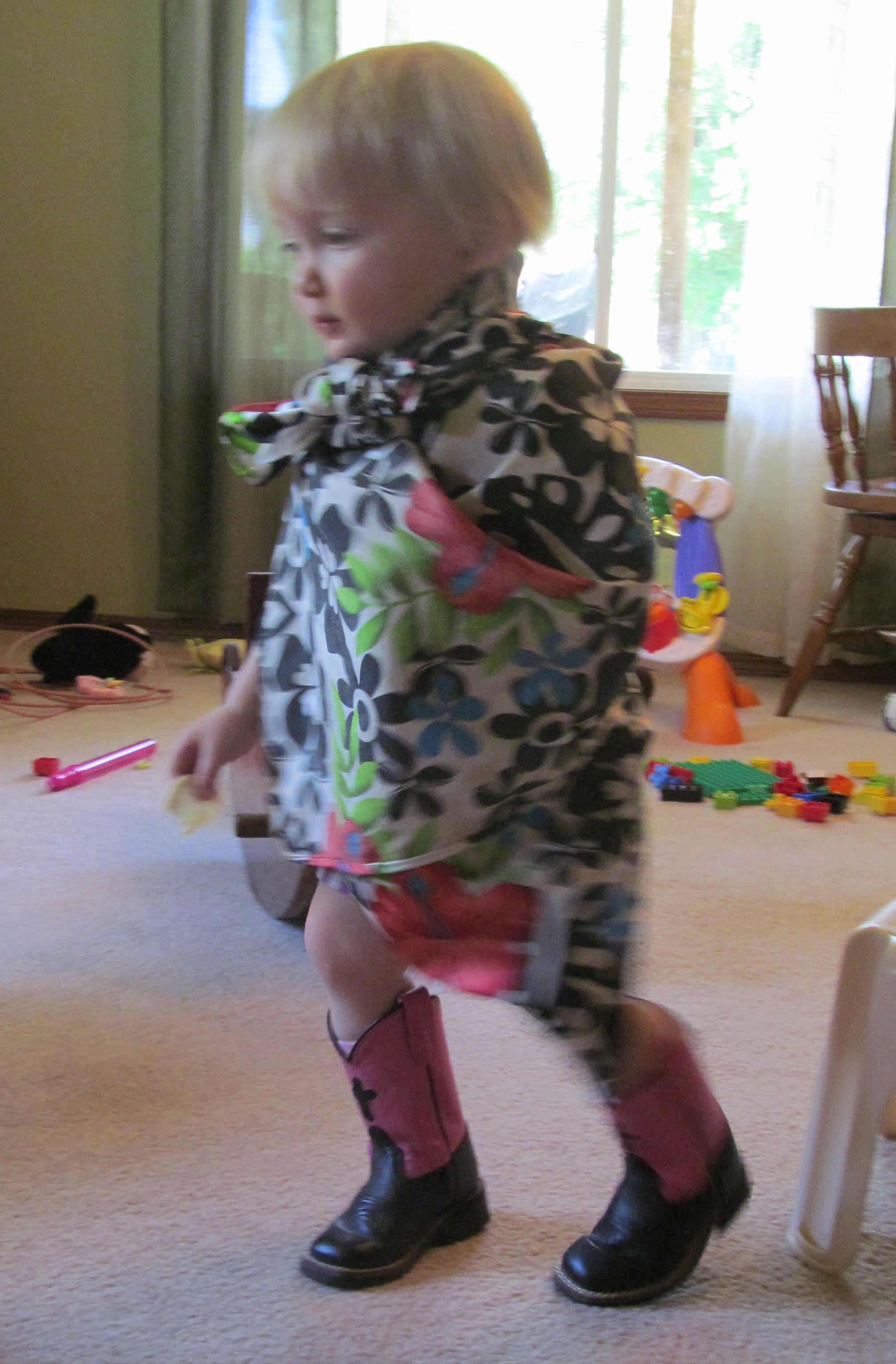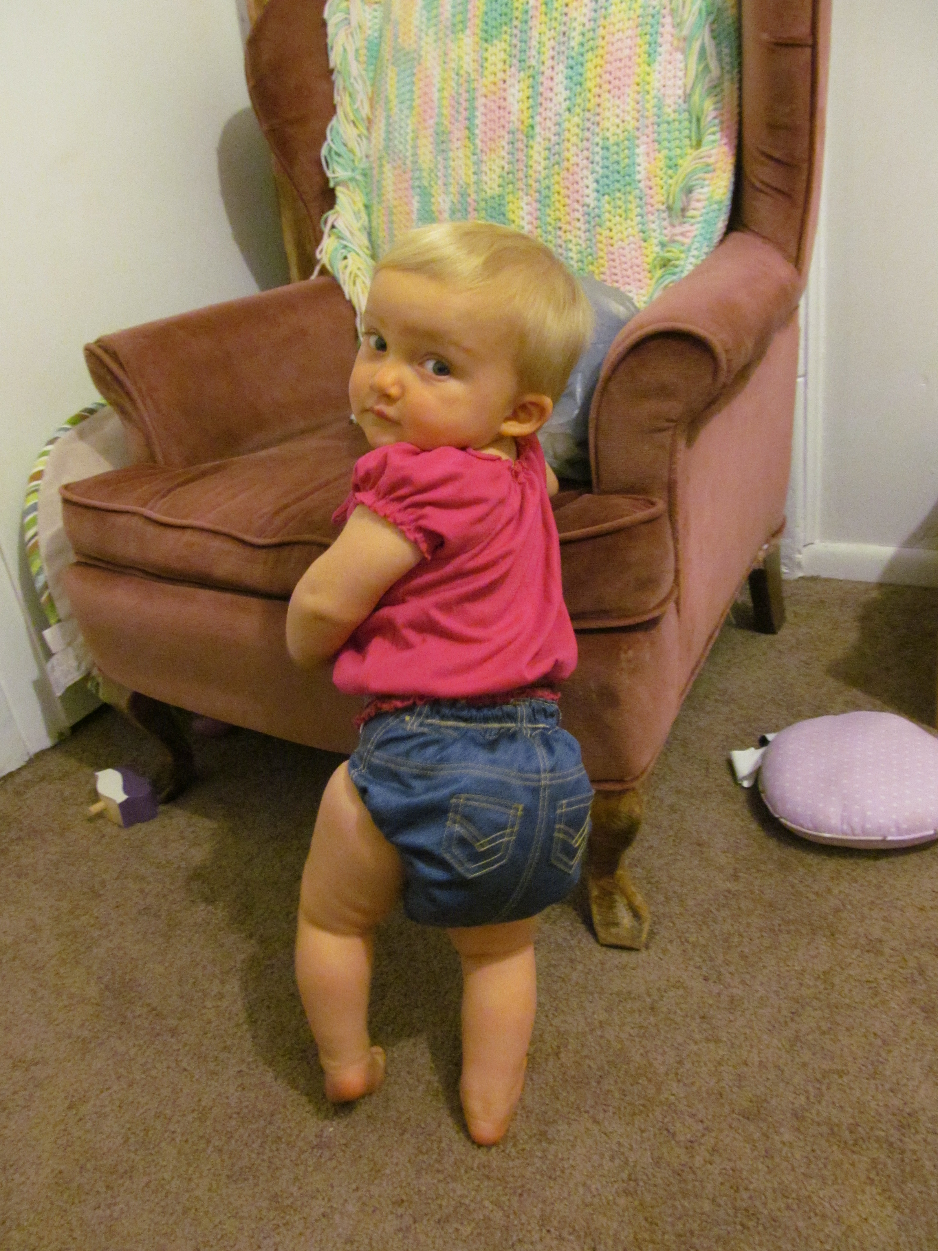 A tot’s modeling portfolio wouldn’t be complete without a dipe shot. Here, Grace models a cloth diaper with faux pockets and (of course!) functional belt loops. If you’re waiting for the picture of her wearing a cloth diaper complete with an actual belt threaded through the loops, you may want to pack a lunch. It’s going to be a long while, plus another longer while.