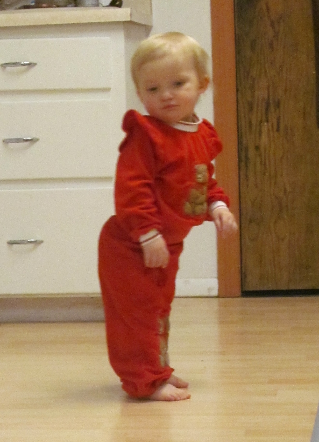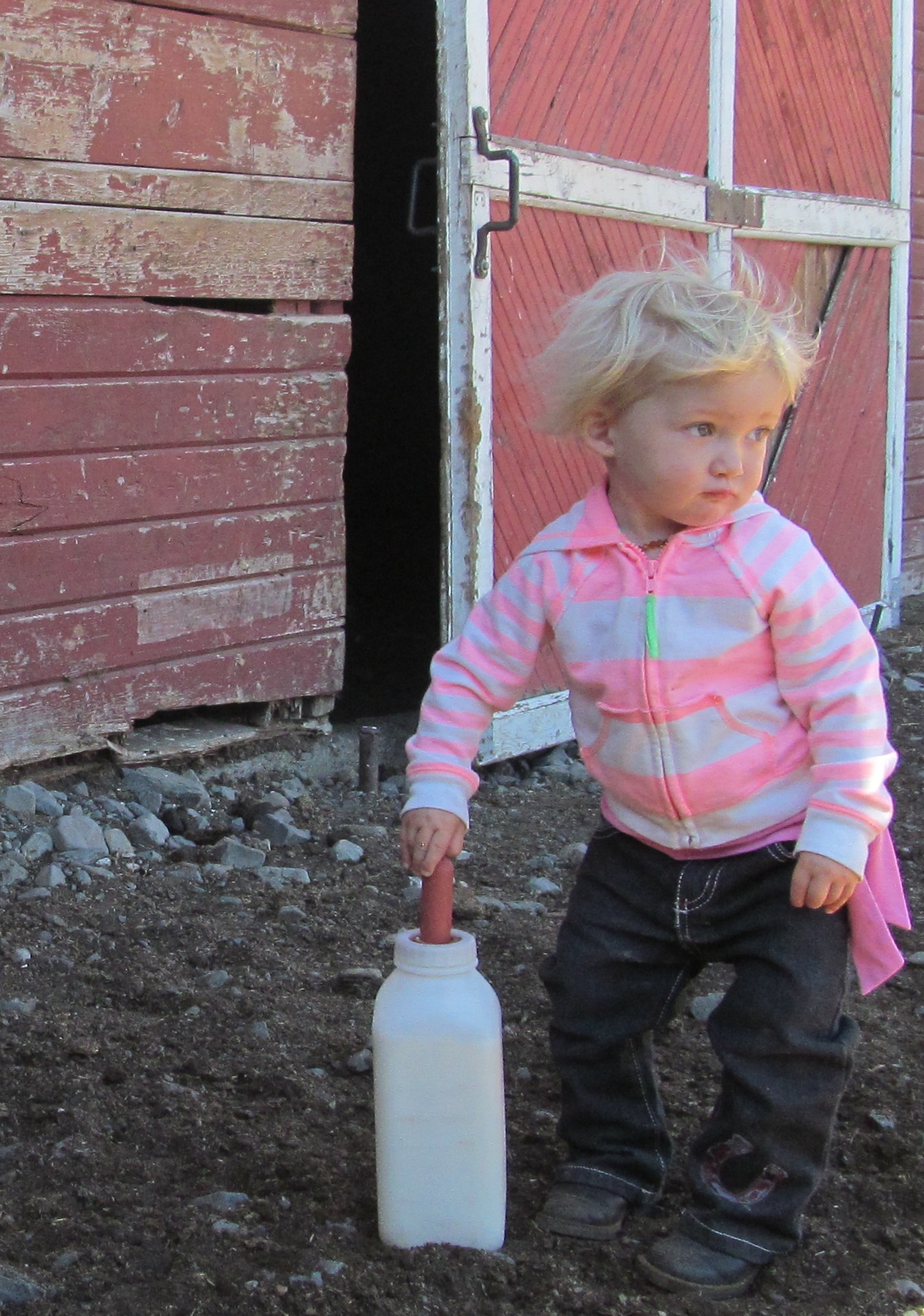 Below, she’s sporting the appropriate attire to go check gates (or put out salt, or something like that) on the ranch with Daddy. Hoodie by Adidas, pants courtesy of hand me downs from a friend, custom handmade booties by Jean Copeland of Grenada, California. Thanks, Jean!