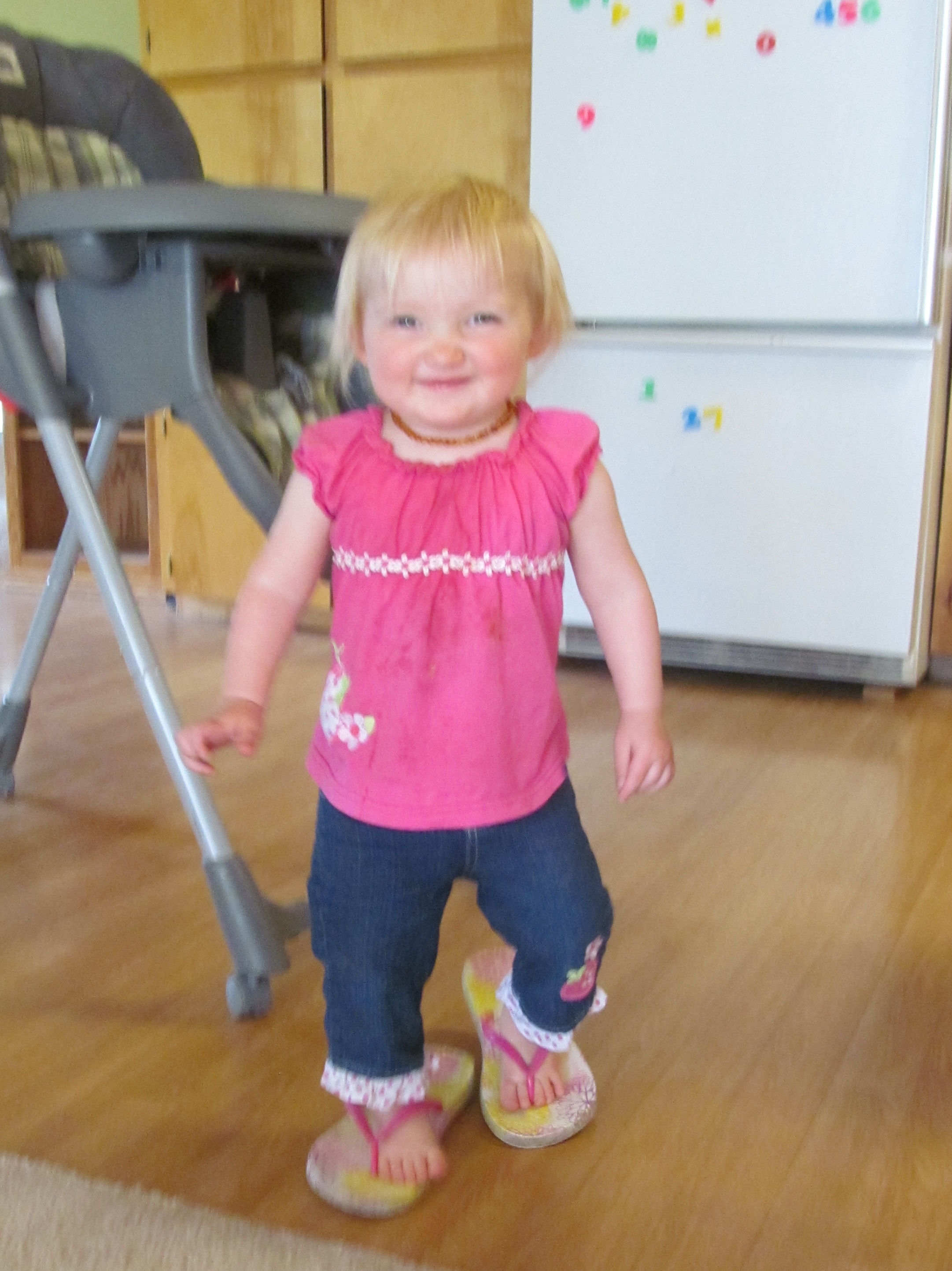 Below, Grace models her mom’s sandals and her own cheesy grin. A favorite activity is stuffing her little feet into the shoes and boots of her mom, dad, visiting cowboys/neighbors/grandparents and shuffling around the house. This morning, she tried to “wear” her dad’s insoles around the kitchen. She was doing great, until she tried to walk.