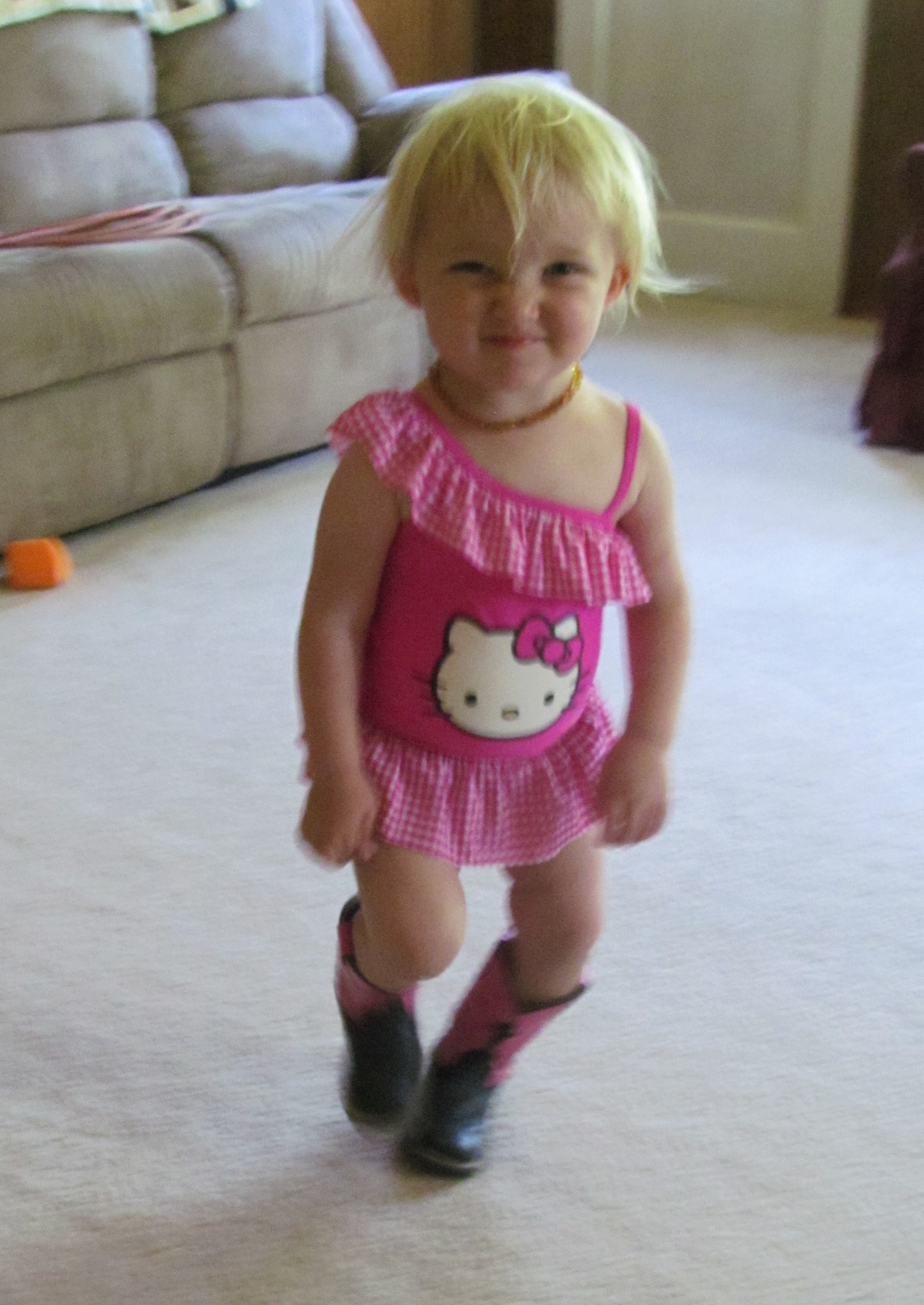 Here she is with her signature patent-pending Scrunchy Face look. Grace is showing off one ensemble from the Summer in the Sticks collection: a Hello Kitty swimsuit, Old West boots which may or may not be on the correct feet, and an amber teething necklace. Hurry and get your outfit purchased before stores run out.