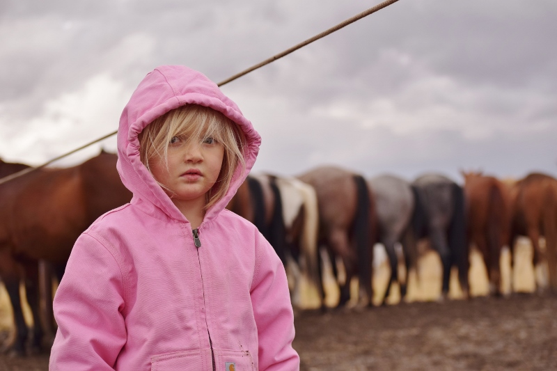 Here at the Spanish Ranch, the cowboy crew wrangles the cavvy in to the ropes after work each afternoon to catch horses for the next day. I often put the toddler in the stroller and the preschooler on her bike and walk down to the barn to visit when they’re catching horses. I was crouched down by the ropes one day next to Grace when I snapped this picture. To her, catching horses on the ropes isn’t a story of bygone days; it just means Daddy’s done with work.